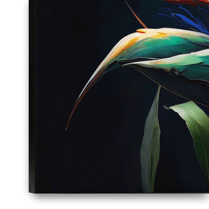 Een betoverende afbeelding van een Paradijsvogelbloem (Strelitzia nicolai) in sprankelende kleuren van oranje tot donkerblauw. De bloemblaadjes van de bloem zijn abstract weergegeven waardoor het geheel een krachtige en dynamische uitstraling krijgt. De achtergrond is donker waardoor de bloem opvallend naar voren komt en er diepte wordt…
