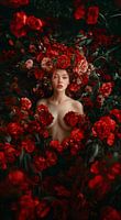 De foto toont een jonge vrouw die omringd wordt door een overvloed aan rode bloemen, voornamelijk rozen. Ze lijkt bijna een met de bloemen, alsof ze uit het bloemendek groeit. De bloemen vormen een kroon om haar hoofd en verspreiden zich over haar lichaam, waardoor het lijkt alsof ze volledig door de natuur wordt omhuld. De vrouw kijkt recht in de camera met een serene, bijna etherische uitdrukking. Haar huid is vlekkeloos en haar lippen hebben een natuurlijke roze tint die harmonieert met de kleuren van de bloemen om haar heen. De achtergrond is donker, wat de intensiteit van de rode bloemen en de vrouwenschoonheid nog meer benadrukt. De compositie van de foto roept een gevoel van mysterie en natuurlijke schoonheid op, waarbij de vrouw lijkt op een mythische figuur uit een sprookje of legende.