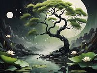 Dit kunstwerk vangt de serene schoonheid van een maanverlichte nacht in een mystieke natuur. De weelderige groene bladeren van een majestueuze boom strekken zich uit naar de hemel, terwijl de zachte reflecties van het maanlicht schitteren op het kalme water. Omringd door delicate waterlelies en rotsachtige bergen, straalt de scène een…