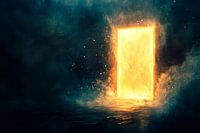 Een stralende deur glinstert in de duisternis en verbindt het zichtbare met het onbekende. Het lijkt de drempel naar nieuwe mogelijkheden en avonturen, terwijl er zachtjes water omheen stroomt. Deze fascinerende voorstelling brengt een mystieke sfeer in de woonkamer en stimuleert de verbeelding van je gasten.