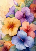 Een kunstdruk met hibiscus in verschillende magische kleuren