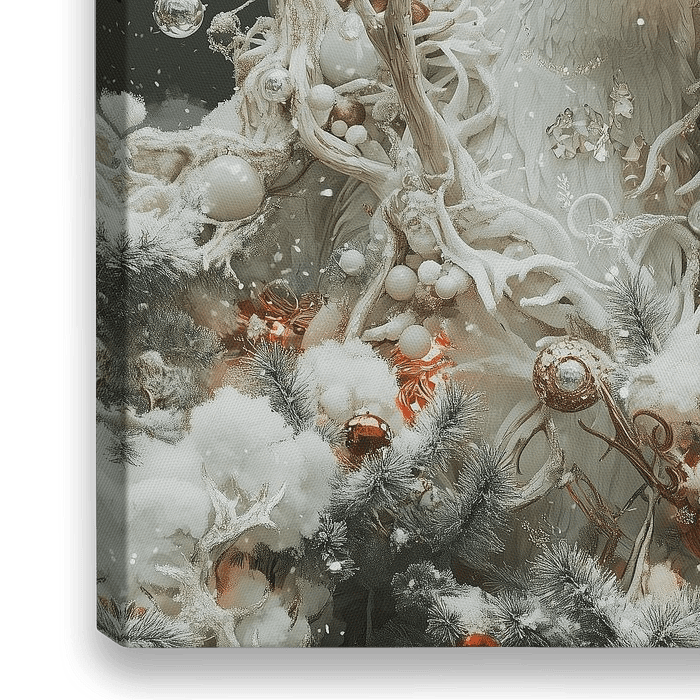 Een sereen, kunstzinnig kersttafereel met een elegant rendier dat staat in een uitgestrekte, sneeuwwitte omgeving. Het rendier is sierlijk, magisch en kunstzinnig. Rondom fonkelen fijne details — kleine ijskristallen, zachte bokeh-lichtjes en subtiele kerstdetails. De sfeer voelt vredig, magisch en puur.