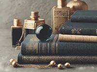 Magische kristallen bol, rituele boeken en flesjes met drank en gif. Alchemie, Halloween, magie, hekserij, waarzeggerij