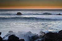 Zeezicht foto van de prachtige kust nabij El Golfo op Lanzarote, een schitterend eiland behorend tot de Canarische Eilanden (Spanje). De foto is een paar minuten na zonsondergang genomen. Door de iets langere sluitertijd ontstaat een sluier van water over de rotsen, wat een mystiek beeld oplevert, in combinatie met de oranje gekleurde…