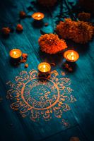 Hier ontvouwt zich een spel van warm licht en levendige kleuren: Delicate bloemen en flikkerende theelichtjes omlijsten een artistieke mandala die meteen gratie en harmonie uitstraalt. Deze compositie brengt een vredige sfeer in een woonkamer of is ideaal voor een meditatieve hoek waar rust en contemplatie centraal staan.