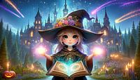 Een jong meisje met een grote heksenhoed versierd met verse bloemen staat op een pad dat leidt naar een imposant kasteel. Ze houdt een gloeiend spreukenboek in haar hand en kleine lichtbolletjes zweven om haar heen, terwijl kometen de nachtelijke hemel op de achtergrond verlichten. Haar ogen zijn groot van verwondering over de magie die ze ontketent en ze wordt omringd door een sfeer van verwondering en schoonheid. De natuur lijkt te reageren op haar spreuken en alles baadt in een zacht, magisch licht.