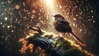 Magische regen: een vogel onder een fonkelende hemel van artefacti