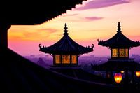 Met een betoverend spel van paarse en oranje kleuren stralen de elegante pagodedaken een vredige sfeer uit in de schemering. De zachte lijnen en lichtgevende ramen nodigen uit om te dromen en maken dit kunstwerk perfect voor de slaapkamer, waar het 's nachts rust en inspiratie biedt.