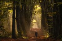 De wandelaar in deze majestueuze bomenlaan geniet van de natuurlijke schoonheid van de hoge bomen en de zonnestralen. Het is alsof je even ontsnapt aan de drukte van het dagelijks leven en je onderdompt in de serene pracht van de natuur.
