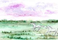 Deze aquarel toont elfachtige, bijna transparante eenhoorns voor een prachtig fantasielandschap.