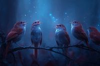 Een nachtelijke scène in diepblauw, waarin vogels als een klein koor samen zingen.