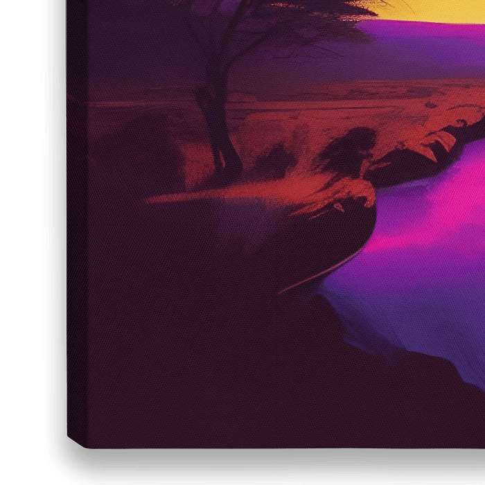 Een betoverend kunstwerk dat de toeschouwer meeneemt naar een spirituele wereld vol levendige kleuren en symboliek. In het middelpunt van de compositie stroomt een beekje, kronkelend door een schilderachtig landschap. Boven deze idyllische scène strekt zich een lucht uit die een overgang tussen geel, oranje, roze en paars laat zien, wat…