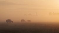 Net voor zonsopkomst, de natuur ontwaakt in een landschap gehuld in nevel. Een typisch Nederlands beeld met de grazende koeien en aan de horizon zie je nog net de wieken van de molen boven de mist uitsteken.