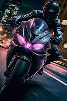 Kunst in beweging. Een verbluffende explosie van roze en paarse poeder volgt de motorfiets en creëert een surrealistisch gevoel van kracht. Deze foto legt de rauwe energie en chaotische schoonheid vast van een motorrijder die de grenzen van de fysica doorbreekt in een uitbarsting van kleur.