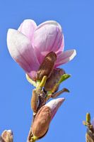 Ik vind hier vooral de combinatie van de tere magnoliabloem en knoppen met de blauwe lucht mooi vanwege het contrast, terwijl de sfeer toch zacht blijft.