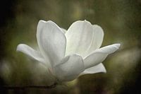 Stijlvolle close-up foto van een bloeiende, witte magnolia bloem met een groen landschap op de achtergrond.