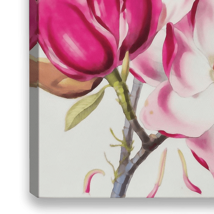 Helder bloeiende magnoliabloemen in de ochtend als schilderij op een aangename beige achtergrond.
