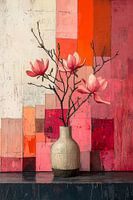 Magnolia Blokwerk II brengt een krachtig samenspel van bloemen en vlakken. De bloesem lijkt te dansen voor een achtergrond van expressieve rood- en rozetinten, onderbroken door warme oranje accenten en zacht gebroken wit. De compositie oogt dynamisch maar harmonieus — alsof elk element precies daar staat waar het hoort.