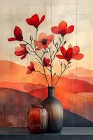 Magnolia Glow combineert de zachtheid van bloesem met de warmte van een ondergaande zon. Rode en oranje magnolia’s steken af tegen een gelaagd landschap van heuvelachtige vormen in abrikoos, koper en aubergine. De combinatie van een matte vaas en een glanzend glazen exemplaar geeft het beeld extra textuur en karakter.