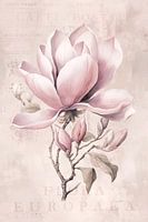 Charmante magnoliabloesems op een subtiel gestructureerde achtergrond met enkele tekstfragmenten in zachte pasteltinten poederroze
