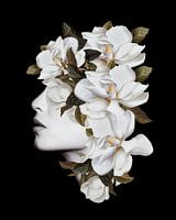 Een surrealistisch en romantisch portret van een vrouw, omringd door magnolia's.