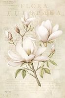 Betoverende magnoliabloesems op een subtiel gestructureerde achtergrond met enkele tekstfragmenten in zacht pastelbeige, crème en groen
