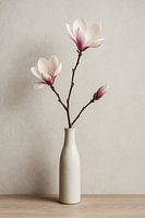 Deze kunstprint vangt de serene schoonheid van de magnolia in volle glorie. Twee open bloemen en een knop staan elegant op een tak, geplaatst in een slanke aardetint vaas. De zachte roze en witte tinten van de bloemblaadjes vormen een harmonieus contrast met de neutrale achtergrond en benadrukken de natuurlijke elegantie van deze bloem.