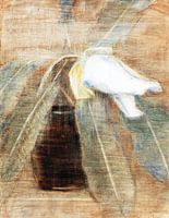 Stilleven van een witte bloem, een plant in een vaas die bruin is.