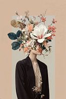 Een surrealistisch portret waarin een figuur in zwart jasje versmelt met een weelderig bloemstuk. Zachte magnolia's, koraalkleurige bessen en diepgroene bladeren vormen een elegante compositie die de plaats van het hoofd inneemt. De zachte vintage tinten en de contrast tussen de strakke kleding en organische bloemenexplosie creëren een intrigerend spanningsveld tussen natuur en cultuur.