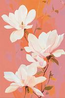 Een digitale illustratie van sierlijke magnolia bloemen in zuiver wit, subtiel aangezet met roze tinten, tegen een warm koraalkleurige achtergrond. De compositie straalt een elegante sereniteit uit, waarbij de bloemen als lichte dansers tegen de zachte, warme achtergrond lijken te zweven, omringd door delicate bruine takjes en blaadjes.