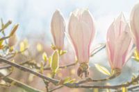 Sfeervolle opname van roze magnolia. Een bloem met zachte kleuren roze, lichtgroen en lichtblauw, pastelkleuren. Dromerige romantische foto. Macrofotografie.