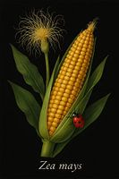 Een botanische illustratie van maïs (Zea mays), in fijne aquarelstijl vastgelegd. De volle aren, krachtige bladeren en subtiele bloeiwijzen tonen de schoonheid van deze aloude cultuurplant. Een ode aan groei, oogst en de zon.