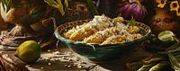 Maïs - Dit smakelijke tafereel vangt de rustieke charme van een culinair moment met een focus op rijkelijk belegde maïskolven in een gedecoreerde keramieken schaal. Het kleurenpalet balanceert warme aardetinten met de goudgele tinten van de maïs en frisse accenten van limoengroen. De compositie is zowel uitnodigend als sfeervol, met een…