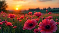 Op de achtergrond vestigt de zonsondergang langzaam de aandacht op zich wanneer de laatste stralen van de dag over het landschap glijden en de klaprozen in een gouden licht baden. Deze scène ademt een vredige en nostalgische sfeer uit die de kijker meeneemt naar een moment van rust en bezinning. Het is een perfect voorbeeld van de schoonheid van de natuur en de magie van de overgang van dag naar nacht, gevangen in één enkel, fascinerend beeld.