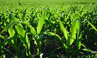 Groene jonge maïsplanten groeien aan de rand van een maïsveld en gloeien tegen het licht.