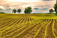 Landschap Landbouw Maïsveld in de vroege zomer met wolken in Opper-Zwaben Duitsland