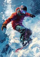 Een snowboarder glijdt moeiteloos van een ongerepte berghelling, omringd door een adembenemend landschap. Dit serene beeld toont de schoonheid van de natuur en de gratie van snowboarden.