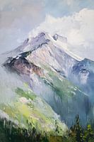 Een bergtop ligt majestueus in het hart van de natuur, zijn besneeuwde toppen weerspiegelen het licht van de hemel. Omringd door zachte, groene hellingen die in zachte golven stromen en een zweem van mist die over de rotsen zweeft, ontstaat er een harmonieuze symbiose van kracht en gratie die de ziel raakt.