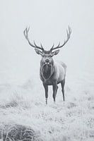 Een prachtig hert staat majestueus in een mystiek, met mist bedekt terrein. Zijn imposante, vertakte geweikroon steekt indrukwekkend af tegen de bleke achtergrond, terwijl de vorst het landschap in een betoverend wit hult. De stilte van de natuur omringt hem en zijn waakzame ogen staren diep in de verte, klaar voor het volgende avontuur.