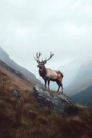 Te midden van een mystiek, mistig landschap staat het majestueuze hert trots op een rots. Zijn imposante, vertakte gewei weerspiegelt de kracht van de natuur, terwijl de glooiende heuvels op de achtergrond een kalme, bijna dromerige sfeer creëren. Een beklijvend moment dat de band tussen het dier en zijn wilde omgeving vastlegt.