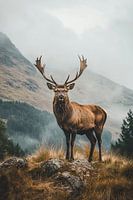 Te midden van een mystiek, mistig landschap troont een majestueus hert op een rotspunt. Zijn indrukwekkende, vertakte gewei lijkt de hemel te begrazen, terwijl zijn krachtige gestalte en de zachte uitdrukking van zijn ogen een stille waardigheid uitstralen. De zachte bries beroert het gras dat zijn komst verwelkomt en voegt een vleugje magie toe aan het tafereel.
