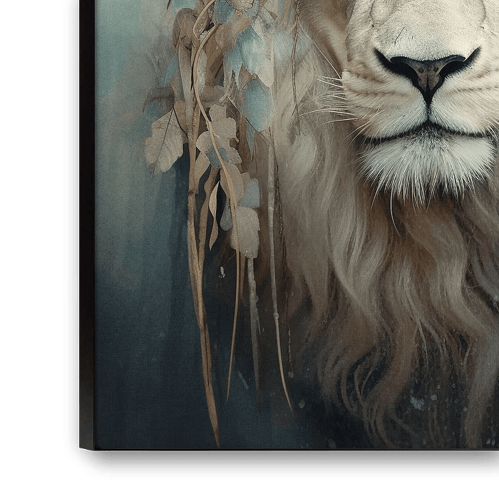 Een majestueuze leeuw, gehuld in een elegant gewaad van delicate bloemen en bladeren in subtiele, harmonieuze kleuren. De leeuw straalt kracht en kalmte uit, zijn gezicht getooid met een zachte, bijna vorstelijke kroon van bloemen, die als een hoogtepunt het beeld domineert. De bloemen en bladeren passen om zijn hoofd als een fijn gerangschikt, natuurlijk sieraad, benadrukken zijn majestueuze aanwezigheid en geven hem een zachte, mystieke uitstraling. De achtergrond is abstract en lichtgekleurd, waardoor de aandacht wordt getrokken naar de leeuw en zijn bloemenkroon, die hem een speciale, bijna droomachtige elegantie verleent.