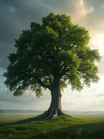 Een foto van een grote eik. De foto brengt een dramatische sfeer over en de achtergrond benadrukt hoe majestueus de eik de lucht in steekt.