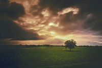 De laatste stralen van de ondergaande zon omarmen de uitgestrekte weilanden, waar een majestueuze boom solitair staat als een bewaker van de tijd. Tegen de verzadigde tinten van de avondlucht steekt zijn robuuste gestalte af als een levend kunstwerk, zijn takken als vingers die de hemel strelen. Het zachte briesje fluistert door zijn bladeren, een melodie van rust en sereniteit die de ziel streelt.