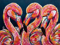 De drie flamingo's worden tot leven gebracht met gedetailleerde penseelstreken die hun verenpracht en statige houding benadrukken. Hun roze tinten contrasteren prachtig met het diepe blauw van de achtergrond, wat een oogverblindend visueel effect creëert.