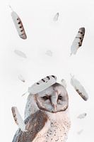 Majestueuze Kerkuil met Zwevende Veren op Witte Achtergrond - Perfect voor Elk Interieur van Elianne van Turennout