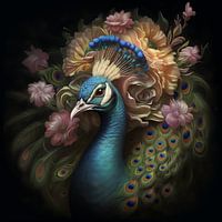 Dit kunstwerk toont een pauw in al zijn pracht, met een weelderig verenkleed dat glinstert in iriserende tinten blauw en groen. De pauw is sierlijk geplaatst tegen een achtergrond van zachte bloemen, waardoor hij straalt als een vorstelijk icoon van schoonheid en mystiek. De bloemen omringen de pauw en versterken het gevoel van elegantie en natuurlijke harmonie, terwijl de donkere achtergrond een dramatisch contrast biedt dat de kleuren van de pauw nog levendiger doet uitkomen.