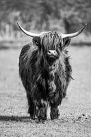 Deze indrukwekkende zwart-wit foto toont een Schotse Hooglander in al zijn natuurlijke pracht. Het imposante dier staat stevig in het veld, met zijn karakteristieke lange vacht en gedraaide hoorns die een krachtig silhouet vormen tegen de achtergrond. De gedetailleerde textuur van zijn vacht en de serene blik brengen een gevoel van rust…