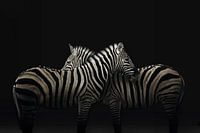 Perfect voor liefhebbers van dierenfotografie en minimalistische kunst, deze afbeelding is een ideale toevoeging aan kunstcollecties, galerieën, of als een opvallend decoratief stuk in een huiselijke omgeving. De combinatie van de krachtige zebra's en de diepe zwarte achtergrond creëert een beeld dat zowel inspirerend als adembenemend is.