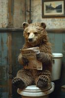 Een majestueuze beer zit op een toilet en leest de krant in een stijlvolle, vintage badkamer.
